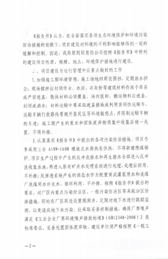 2、内蒙古黄陶勒盖煤炭有限责任公司巴彦高勒矿井水深度处理项目环境影响评价批复;