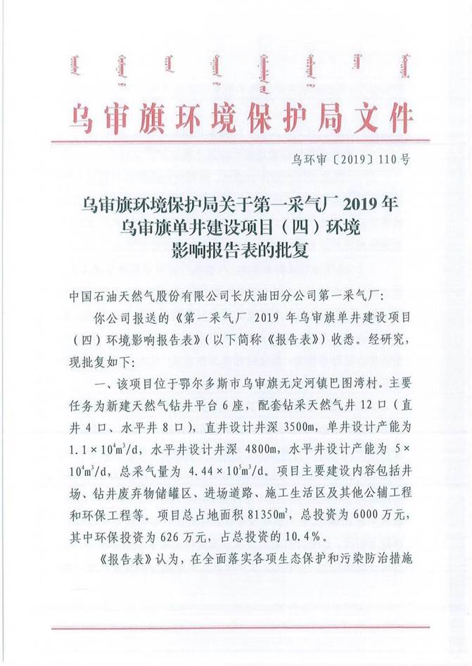 附件 1:《原乌审旗环境保护局关于第一采气厂 2019 年乌审旗单井建设项目(四)建设项目环境影响报告表的批复》(乌环审【2019】110 号);