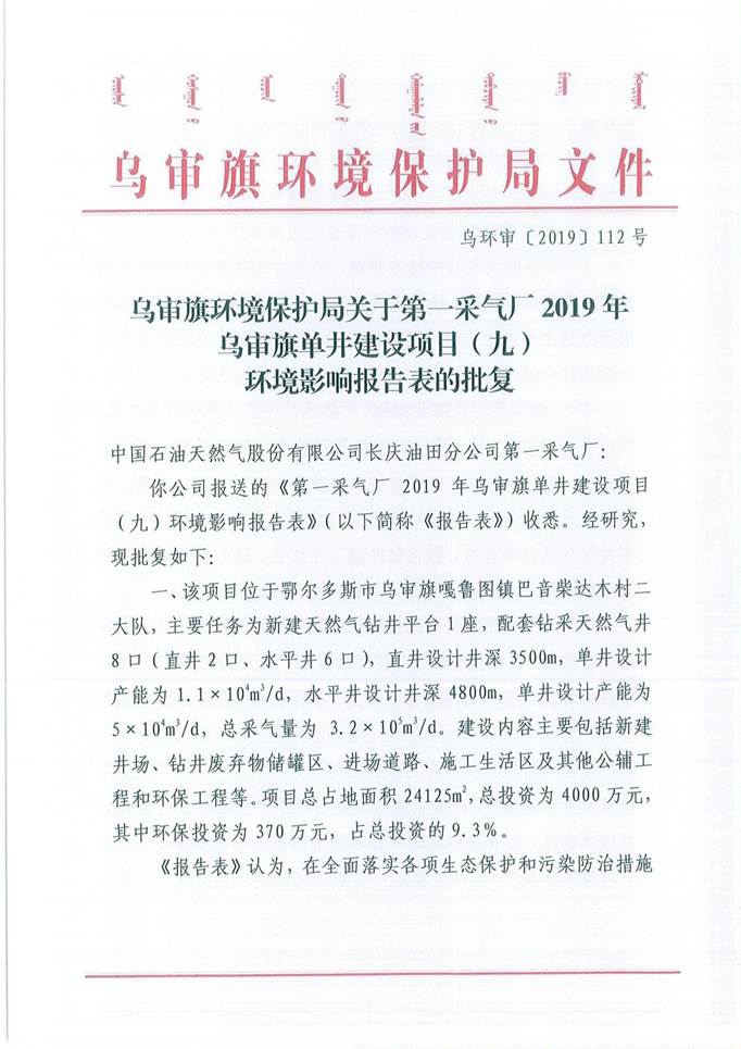 附件 1:《原乌审旗环境保护局关于第一采气厂 2019 年乌审旗单井建设项目(九)建设项目环境影响报告表的批复》(乌环审【2018】112 号);