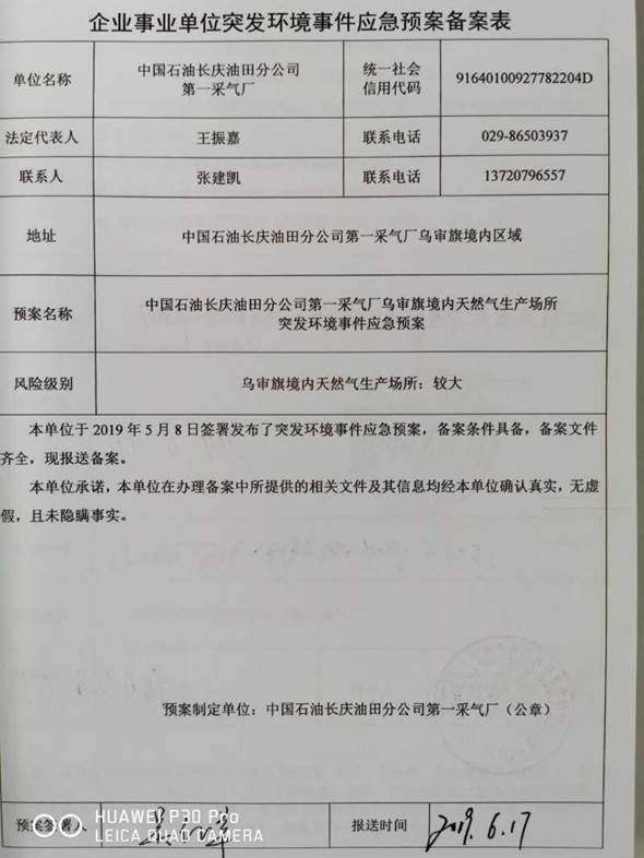 运营单位 | 中国石油天然气股份有限公司长庆油田分公司第一采气厂 | 运营单位社会统一信用代码(或组织机构代码) | 91610000713594558X | 验收时间 | 2019.12.9 |