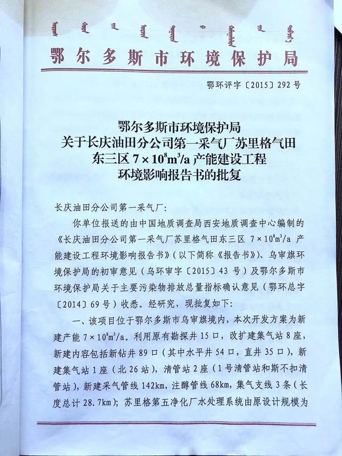 附件 2:《鄂尔多斯市环境保护局关于长庆油田分公司第一采气厂苏里格气田东三区 7×108m3/a 产能建设工程环境影响报告书的批复》(鄂环评【2015】
