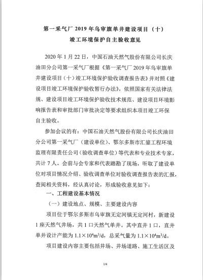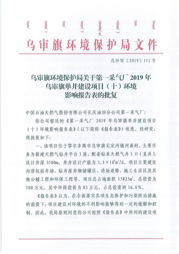 附件 1:《原乌审旗环境保护局关于第一采气厂 2019 年乌审旗单井建设项目(十)建设项目环境影响报告表的批复》(乌环审【2018】111 号);