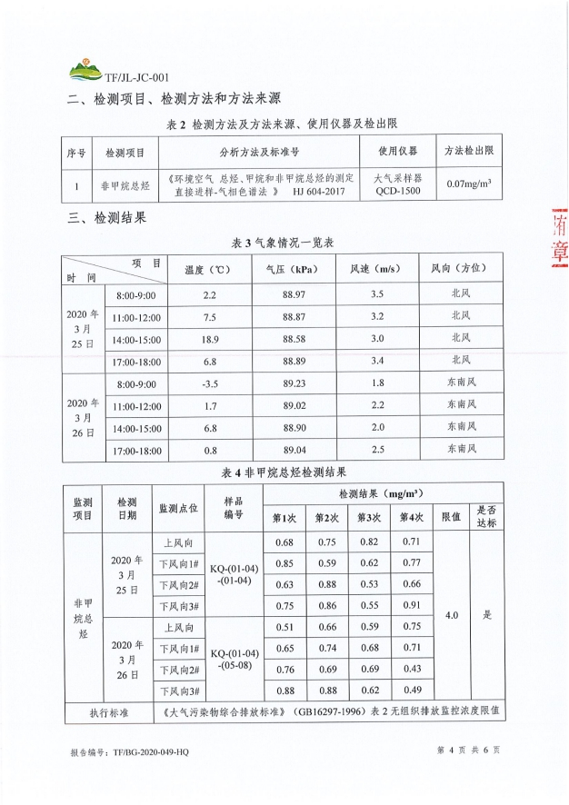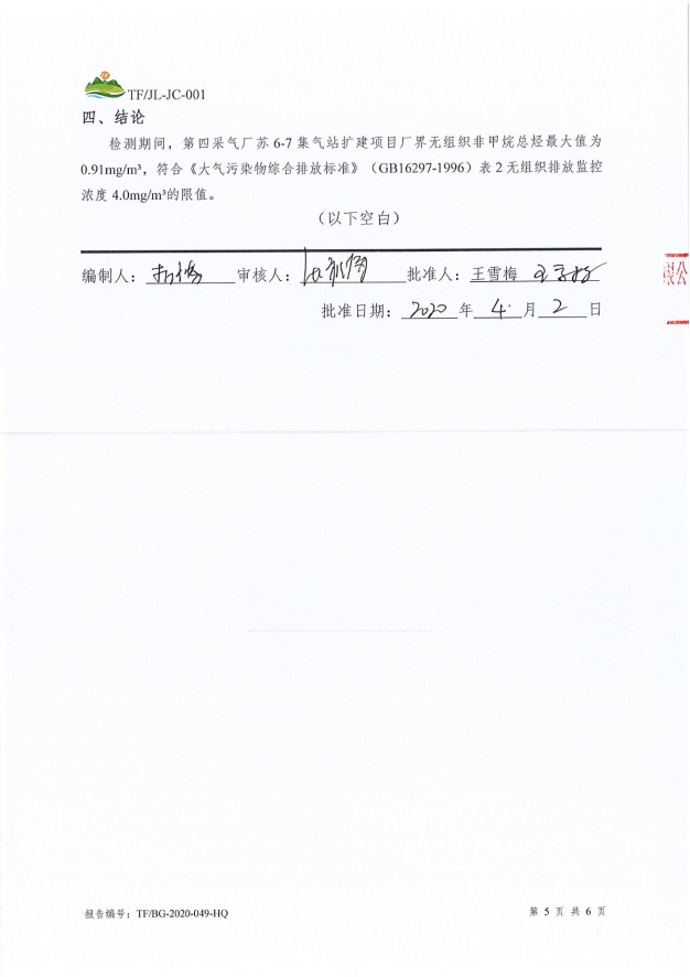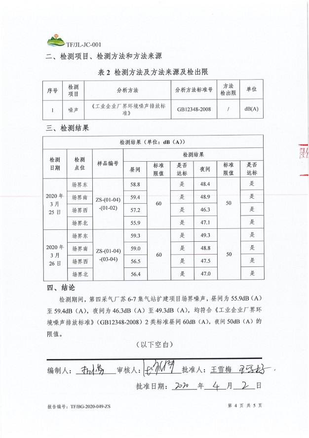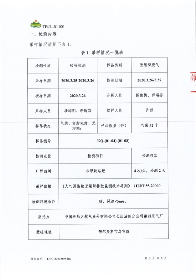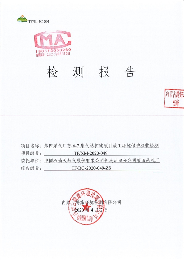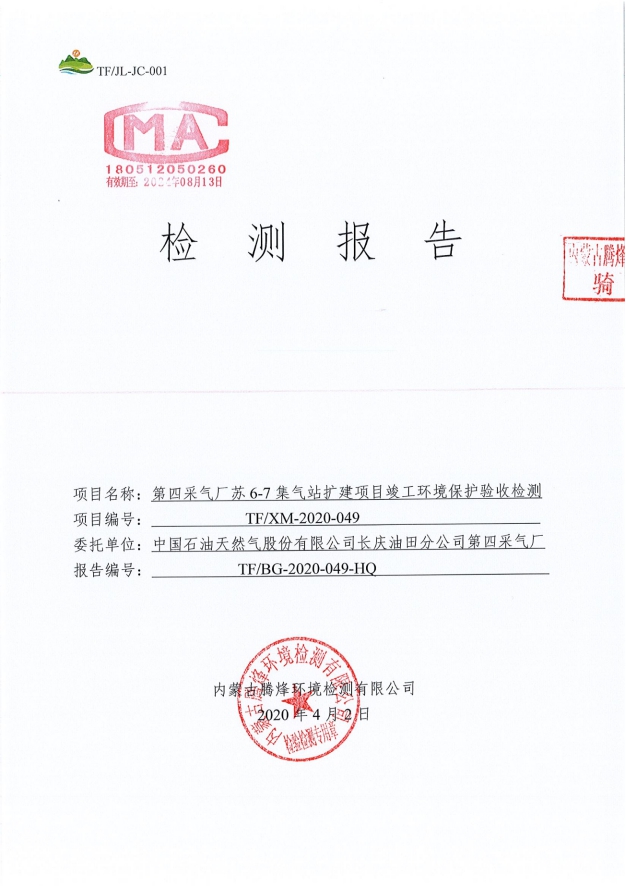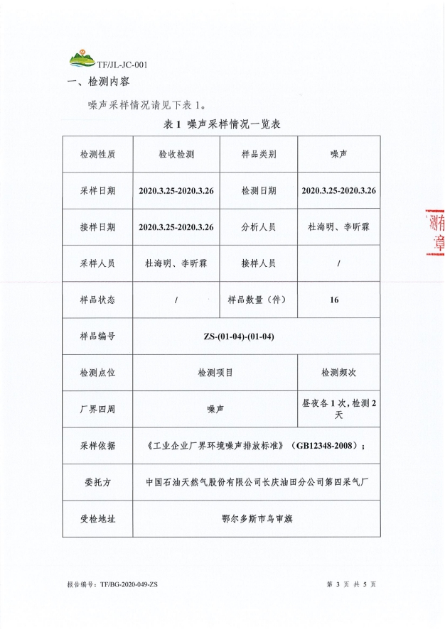 | 环保工程 | 废气 | 天然气放空烟气:利用现有工程 15m 高天然气放空火炬排放。 | 利用现有工程的 1 具 15m 高天然气放空火炬排放。 | 符合环评 要求 | 压缩机组天然气燃烧烟气:通过 1 根 15m 高烟囱排放。 | 新增 1 根 15m 烟囱 | 符合环评 要求 | 无组织排放:集输系统密闭。 | 无组织排放:集输系统密闭。 | 符合环评 要求 | 废水 | 项目放空火炬废液和气液分离废水通过排污总管进入 3 座30m3 玻璃钢污水罐贮存,定期通过采出液输出管道送到第一天然气处理厂处理,集气站属无人值守站,不涉及生活 污水。 | 项目气液分离废水通过排污总管进入3 座30m3 采出液缓冲罐贮存,定期通过采出液输出管道送到第一天然气处理厂处理,集气站属无人值守站,不涉及生活污水。 | 噪声 | 选用低噪声设备,加装基础减振,厂房隔声,风机消声等 措施。 | 选用低噪声设备,加装基础减振,厂房隔声,风机消声等措施。 | 符合环评 要求 | 固废 | 设备废润滑油集中收集,产生后立即由有资质单位运走处 理,不在站内储存;集气站属无人值守站,因此无生活垃 圾产生,巡检人员产生的生活垃圾直接由巡检车带走,不 随地丢弃。 | 设备废润滑油集中收集,产生后直接由达拉特旗忠信防水材料有限责任公司安排车辆拉运,清管废渣产生后集中收集,由鄂托克前旗昌盛环保再生资源有限公司 统一处理。集气站属无人值守站,因此无生活垃圾产生,巡检人员产生的生活垃圾直接由巡检车带走,不随地丢弃。 | 符合环评 要求 |