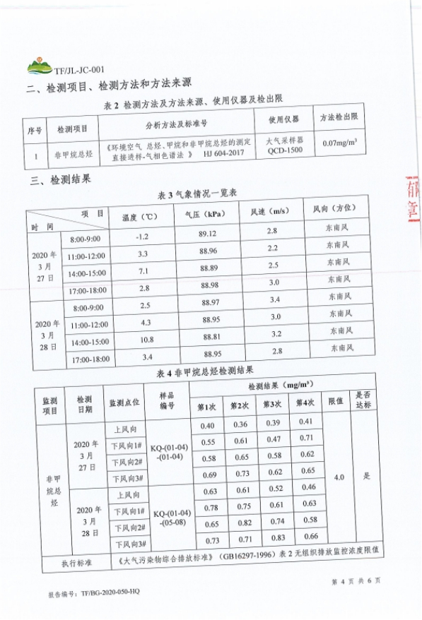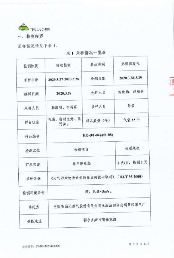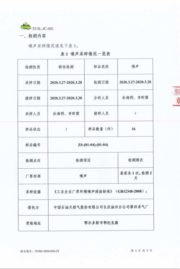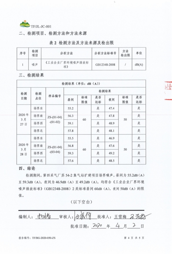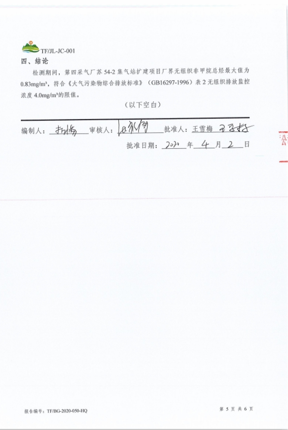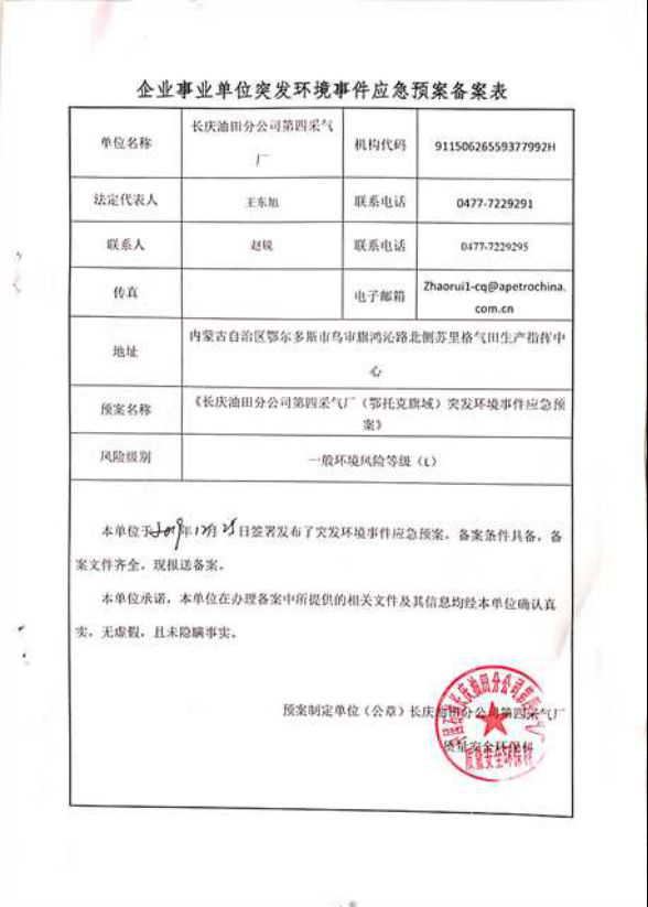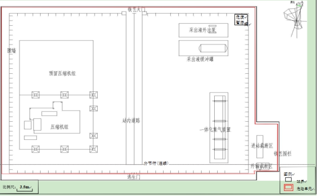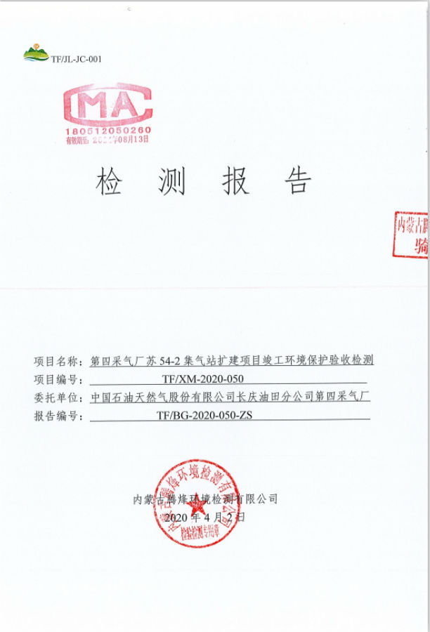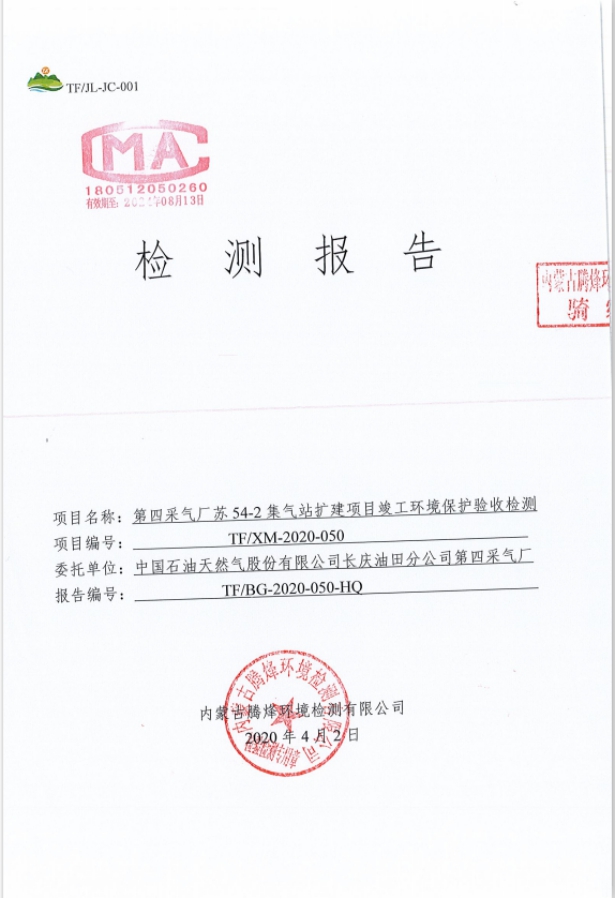 工程概况 1、项目名称 第四采气厂苏 54-2 集气站扩建项目。 2、建设地点 鄂托克旗阿尔巴斯苏木巴音乌素嘎查。 3、建设内容 本项目对现有集气站进行扩建,新增 1 座设计压力为 4.0MPa、集气规模25×104m3/d 的集气站,本项目占地面积为3852平方米。 本项目现有工程组成及设备见表1-1及表1-2。 现有工程组成表1-1 项目组成 | 环评建设内容 | 实际建设内容 | 符合性说明 | 主体工程 | 进站截 断区 | 对采气干管来气进行接收,设有安全阀,超压自动放空功能;通 过安装电动球阀可实现远程紧急截断干管,设置闸阀、安全阀及相关配件。 | 新增天然气采气干管、安全阀,新建紧急截断干管,设置闸阀等相关配件 | 符合环评 要求 | 外输截断区 | 对外输管道进行远程截断;设有手动放空阀、电动球阀、闸阀及相关配件。 | 新增手动放空阀、电动球阀、 闸阀及相关配件。 | 符合环评 要求 | 天然气集气一体化集成装置 区 | 配置1 套50×104m3/d 的集气站一体化集成装置,包括气液分离器分离闪蒸罐、自用气区、外输计量区等。接收站外来气进行气液 分离、计量,分离出的液体进行闪蒸;并对放空气体进行气液分离。 | 配置1 套50×104m3/d 的集气站一体化集成装置,包括气液分离器分离闪蒸罐、自用气区、外输计量区等。接收站外来气进行气液 分离、计量,分离出的液体进行闪蒸;并对放空气体进行气液分离。 | 符合环评 要求 | 压缩机组区 | 配置 1 套 25×104m3/d 压缩机组,压缩机自带电动阀门实现远程关断、压缩机组撬、进出口阀门及相关配件。对天然气进行增压, 满足进入集气支、干线条件。 | 配置 1 套 25×104m3/d 压缩机组,压缩机自带电动阀门实现远程关断、压缩机组撬、进出口阀门及相关配件。对天然气进行增压, 满足进入集气支、干线条件。 | 符合环评 要求 | 采出液缓冲罐区 | 配置 1 座 30m3 采出液缓冲罐,设有采出液外输泵、液位计、蝶阀及相关管道。外输管道与现有工程的采出液外输管道连接。对站场生产产生的采出液进行收集、贮存和运输。 | 配置 1 座 50m3 采出液缓冲罐,设有采出液外输泵、液位计、蝶阀及相关管道。外输管道与现有工程的采出液外输管道连接。对站场生产产生的采出液进行收集、贮存和运输。 | 采出液缓冲罐体积增加20m3 | 辅助工程 | 工具间 | 1 座,1 层,建筑面积为 28.08m2,利用现有工程的 工具间用于工具存放。 | 工具间依托现有工程,未新建 | 依托 | 发电机房 | 1 座,1 层,建筑面积为 35.10m2,利用现有工程的发电机房提供电。 | 利用现有工程的发电机房提供电。 | 依托 | 公用工程 | 供热 | 站内无人值守,不涉及生活用热;生产设备冬季保温采用 电。 | 新增供热系统,站内无人值守,生产设备采用电供热 | 符合环评 要求 | 供电 | 依托现有 10/0.4kV 变电站年新增用电量为 20 万 kW·h,现有变电站负荷能够满足项目日常生产生活用电需求。 | 新增发电机一台及配套自用器 | 新增发电机一台及配套自用器 | 供水 | 集气站属无人值守站,无新增用水。 | 集气站属无人值守站,无新增用水。 | 符合环评 要求 | 进站道路 | 长 100m,宽 4m,为水泥硬化道路。 | 新建水泥硬化路,长100米,宽4米。 | 符合环评 要求 | 环保工程 | 废气 | 天然气放空废气:利用现有工程的 1 具 20m 高天然气放空火炬排放。 | 利用现有工程的 1 具 20m 高天然气放空火炬排放。 | 依托 | 压缩机组天然气燃烧废气:通过 1 根 15m 高烟囱排放。 | 新增 1 根 8m 烟囱 | 新增烟囱高度为8米 | 无组织排放:集输系统密闭。 | 无组织排放:集输系统密闭。 | 采出液缓冲罐体积增大 | 废水 | 项目气液分离废水通过排污总管进入1 座30m3 采出液缓冲罐贮存,定期通过采出液输出管道送到第三天然气处理厂处理,集气站属无人值守站,不涉及生活污水。 | 项目气液分离废水通过排污总管进入1 座50m3 采出液缓冲罐贮存,定期通过采出液输出管道送到第三天然气处理厂处理,集气站属无人值守站,不涉及生活污水。 | 噪声 | 选用低噪声设备,加装基础减振,厂房隔声,风机消声等 措施。 | 选用低噪声设备,加装基础减振,厂房隔声,风机消声等措施。 | 符合环评 要求 | 固废 | 设备废润滑油、分离出的凝析油属于危险废物,在站区东 北角设大小为 6m2 的危废暂存间暂存,最大储存量 0.5t, 定期交由有资质单位处理项目不新增劳动员,因此无生活 垃圾产生。 | 不设置危废暂存间,产生后立即转运达拉特旗忠信防水材料有限责任公司处置 | 本站不设置危废暂存间 |