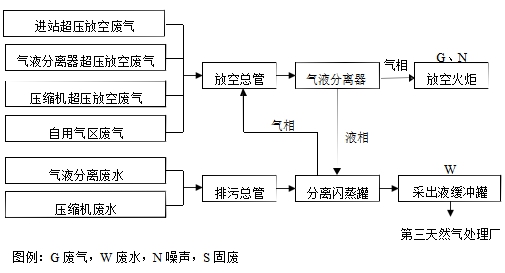 图1-5放空、排污工艺流程及产污节点图 8、劳动定员及其它 本项目为无人值守站,集气站及管线均采取工作人员定期巡视的工作制度。 9、环保投资明细 本项目总投资621万元,其中环保投资53万元,占总投资8.5%,详见表1-4。 表1-4采取的环保措施及投资估算一览表 单位:万元 类别 | 污染源 | 环保措施 | 投资(万元) | 废气 | 放空火炬 | 利用原有20m高火炬 | / | 站区压缩机 | 8m排气筒 | 5 | 废水 | 生产废水 | 玻璃钢污水罐 | 15 | 噪声 | 压缩机、泵等设备 | 选用低噪声设备、基础减震等 | 9 | 固废 | 废机油 | 依托原有集气站废机油的收集处理 | 10 | 生态 | 厂区绿化硬化 | 14 | 合计 | 53 |