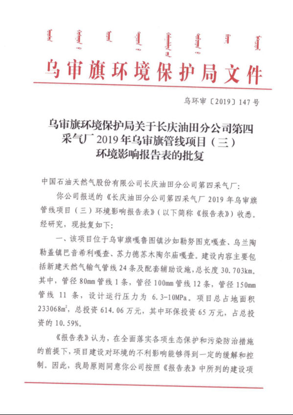 附件1:《长庆油田分公司第四采气厂 2019 年乌审旗管线项目(三)环境影响报告表的批复》(乌环审【2019】147号);