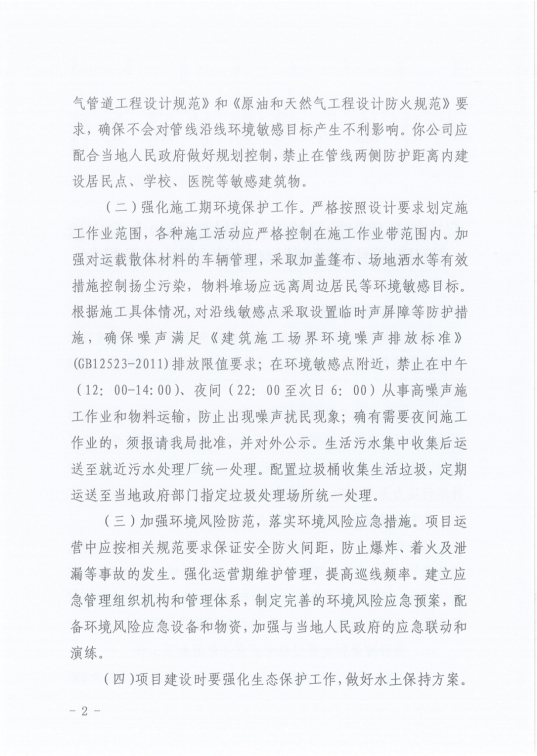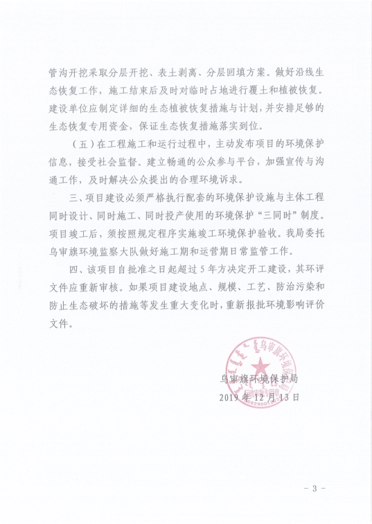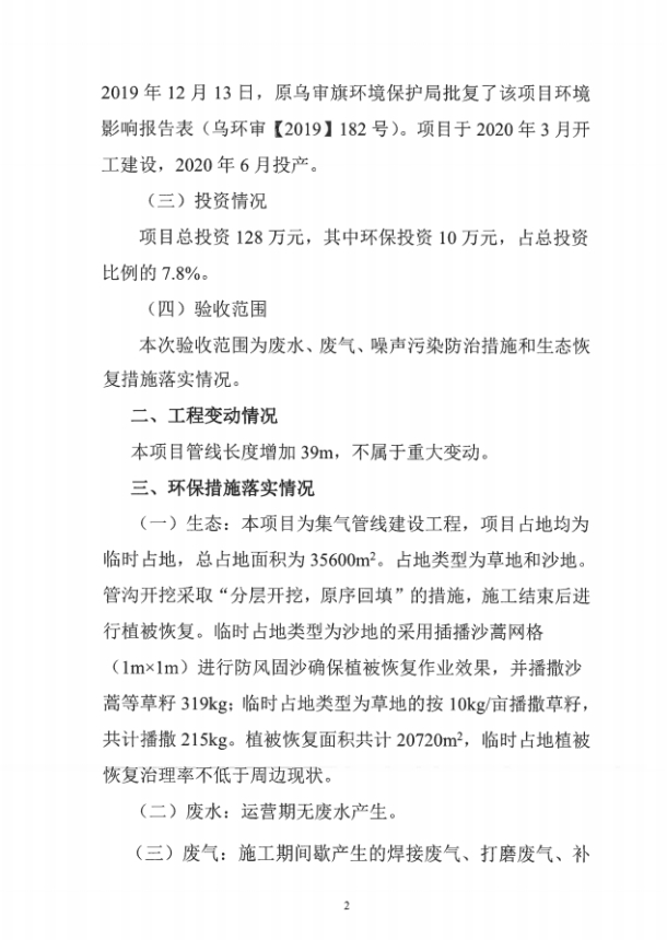 (2)《长城钻探2019年乌审旗第四批管线建设项目环境影响报告表的批复》 (乌环审【2019】182号)。