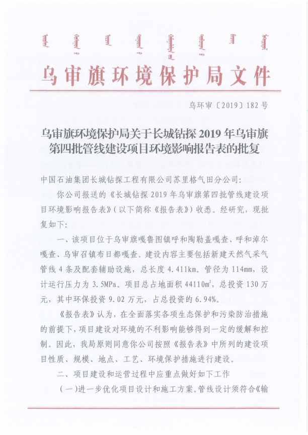 附件1:《原乌审旗环境保护局关于长城钻探2019年乌审旗第四批管线建设项目环境影响报告表的批复》(乌环审【2019】182号);