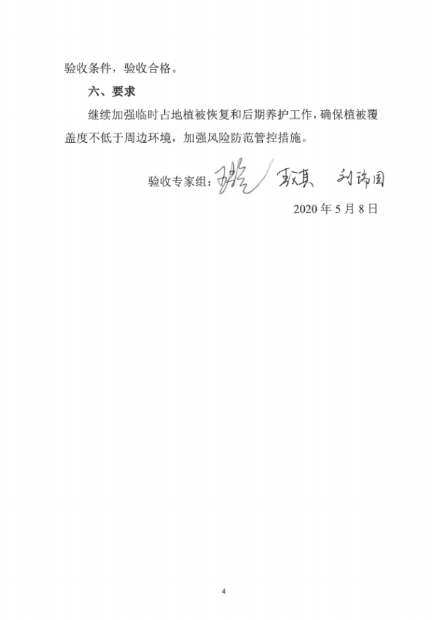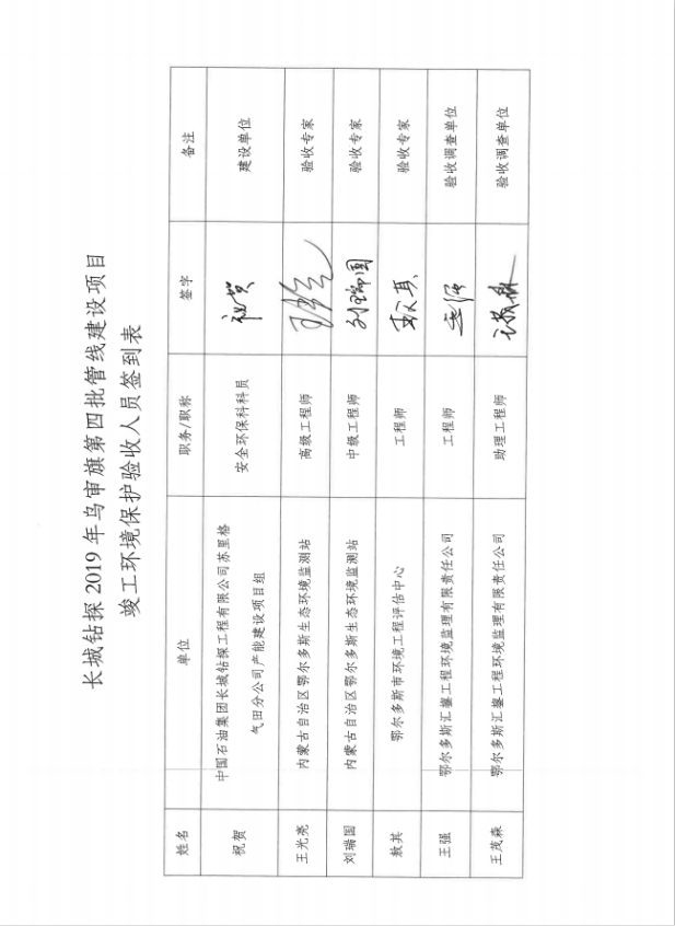 附件4:《长城钻探2019年乌审旗第四批管线建设项目竣工环境保护自主验收意见》及签到表。