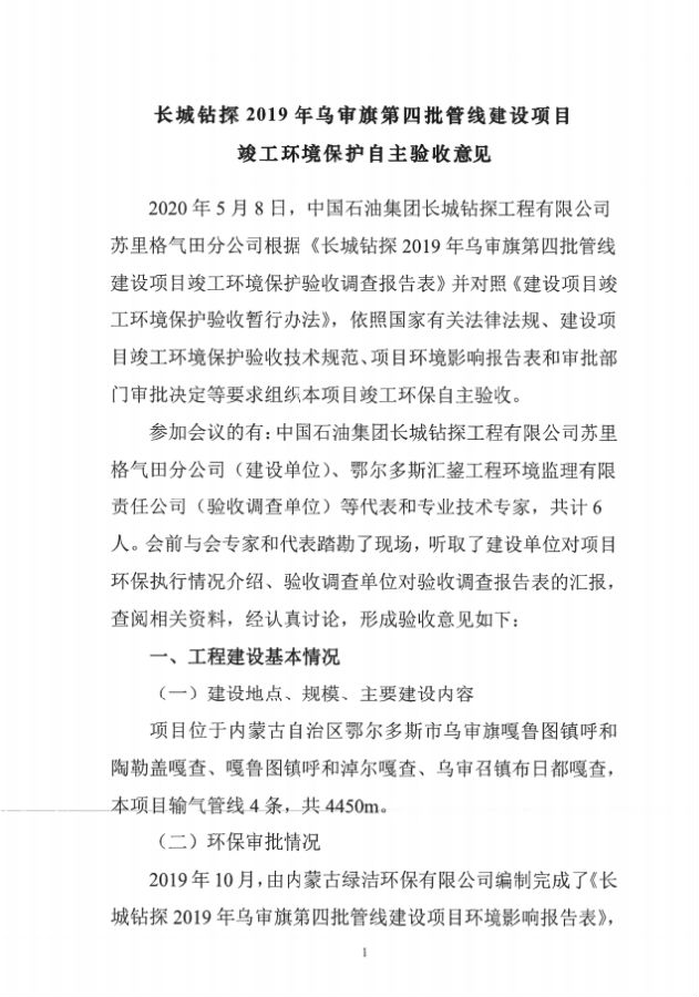 (1)《长城钻探2019年乌审旗第四批管线建设项目环境影响报告表》;