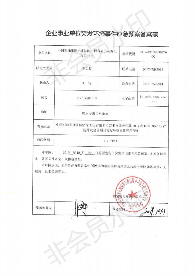 运营单位 | 中国石油集团长城钻探工程有限公司苏里格气田分公司 | 运营单位社会统一信用代码(或组织机构代码) | 91150626328968760Q | 验收时间 | 2020.5 |