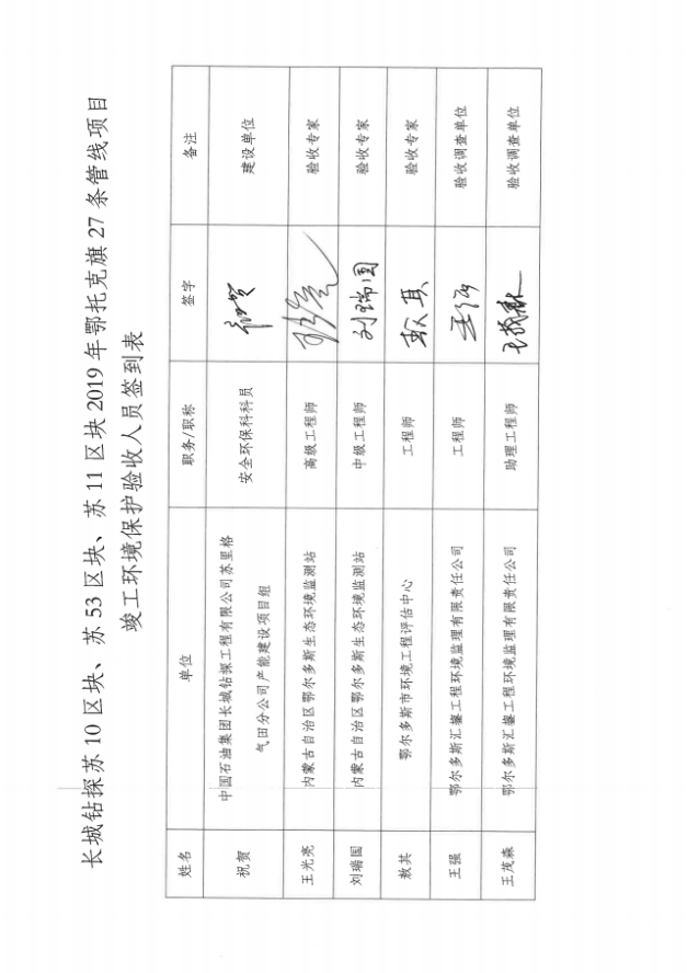 附件3:《长城钻探苏10区块、苏53区块、苏11区块2019年鄂托克旗27条管线项目竣工环境保护自主验收意见》及签到表。