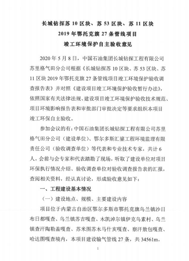 1、《长城钻探苏10区块、苏53区块、苏11区块2019年鄂托克旗27条管线项目环境影响报告表》;