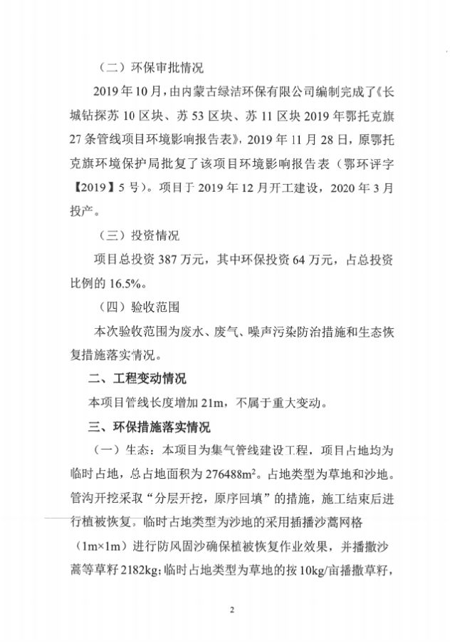 2、《长城钻探苏10区块、苏53区块、苏11区块2019年鄂托克旗27条管线项目环境影响报告表的批复》(鄂环评字【2019】5号文)。