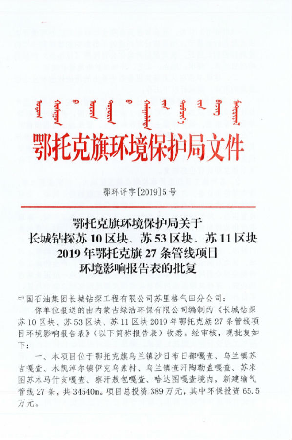 附件1:《鄂托克环境保护局关于长城钻探苏10区块、苏53区块、苏11区块2019年鄂托克旗27条管线项目环境影响报告表的批复》(鄂环评字【2019】5号文);