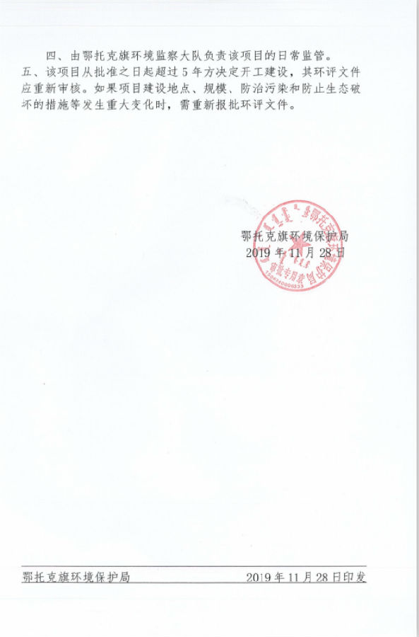 环评文件审批机关 | 原鄂托克旗环境保护局 | 审批文号 | 鄂环评字【2019】5号文 | 环评文件类型 | 建设项目环境影响报告表 |