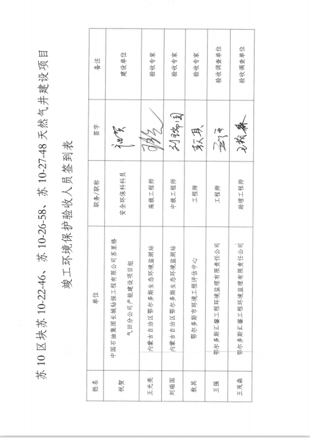 附件4:《苏10区块苏10-22-46、苏10-26-58、苏10-27-48天然气井建设项目竣工环境保护自主验收意见》及签到表。