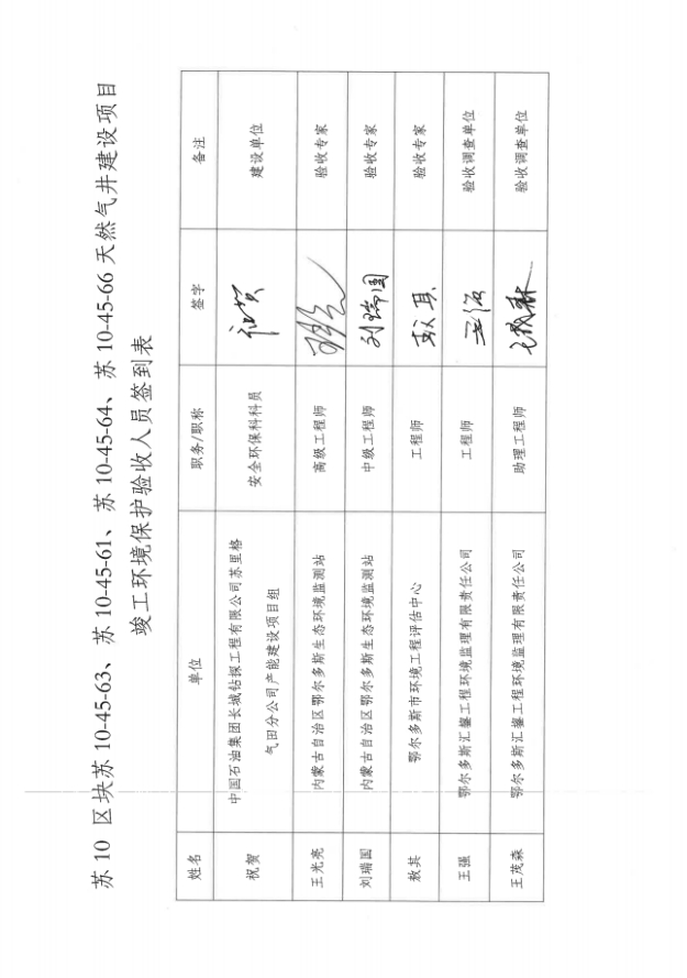 附件4:《苏10区块苏10-45-63/61/64/66天然气井建设项目竣工环境保护自主验收意见》及签到表。