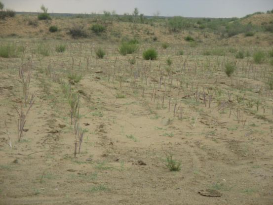 沙地 | 临时占地的土地平整、覆土、插播沙柳网格等有效措施,防风固沙 | 按照10kg/亩方式撒播草籽,累计撒播草籽234kg,植被恢复面积15600m2 |