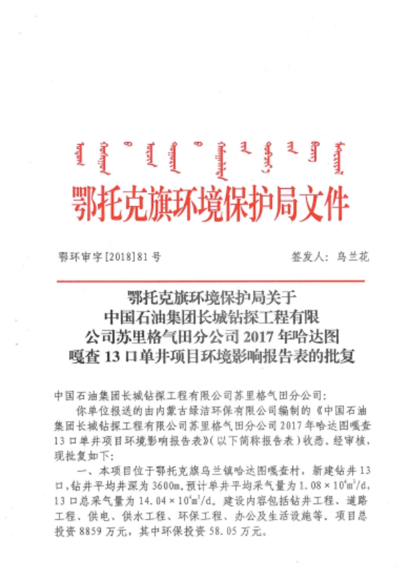 附件1:《鄂托克旗环境保护局关于中国石油集团长城钻探工程有限公司苏里格气田分公司2017年哈达图嘎查13口单井项目环境影响报告表的批复》(额鄂环审字【2018】81号);