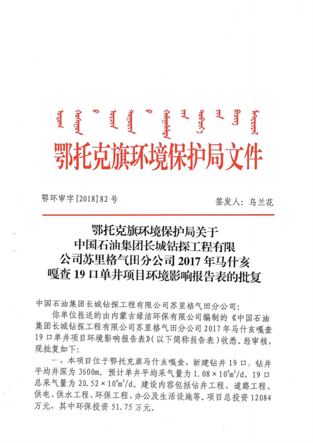附件1:《鄂托克旗环境保护局关于中国石油集团长城钻探工程有限公司苏里格气田分公司2017年马什亥嘎查19口单井项目环境影响报告表的批复》(鄂环审字【2018】82号文);