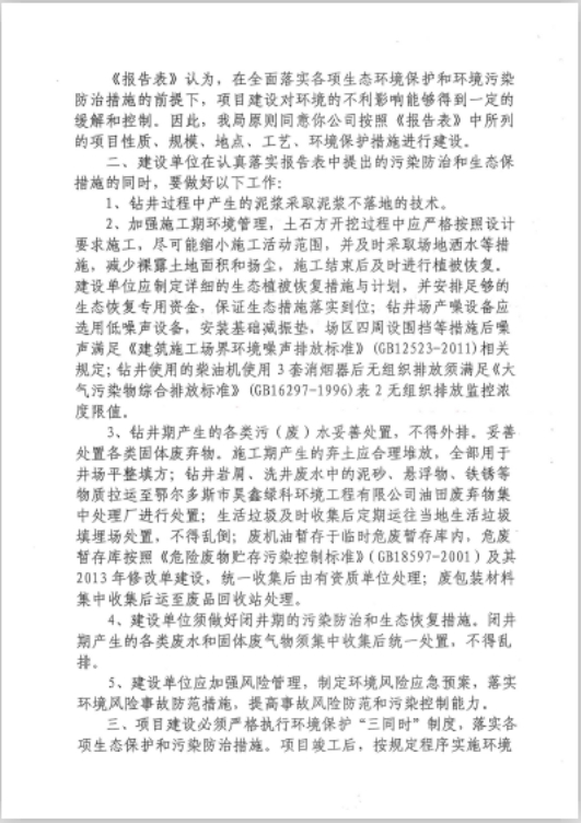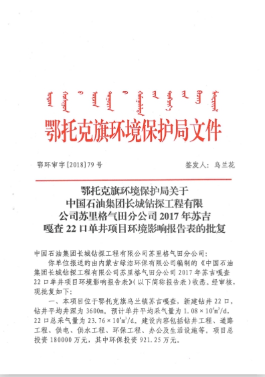 附件1:《鄂托克旗环境保护局关于中国石油集团长城钻探工程有限公司苏里格气田分公司2017年苏吉嘎查22口单井项目环境影响报告表的批复》(鄂环审字【2018】79号);