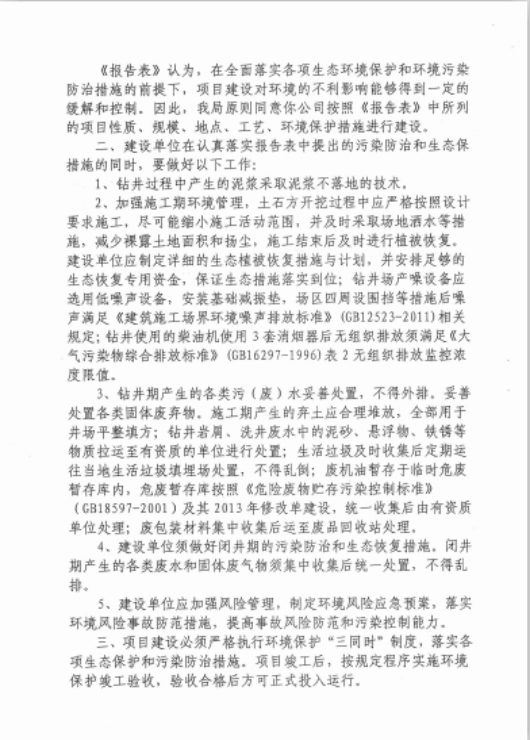 备注:实际环保投资较环评中增加12.8万元,增加投资主要用于钻井岩屑、泥浆及压裂返排液的处置。 |