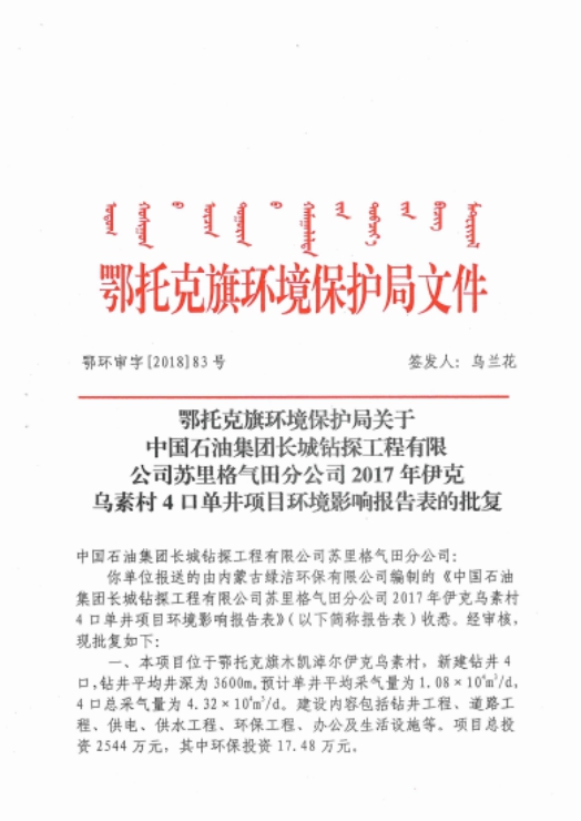 附件1:《原鄂托克旗环境保护局关于中国石油集团长城钻探工程有限公司苏里格气田分公司2017年伊克乌素村4口单井工程项目环境影响报告表的批复》(鄂环审字【2018】830号);