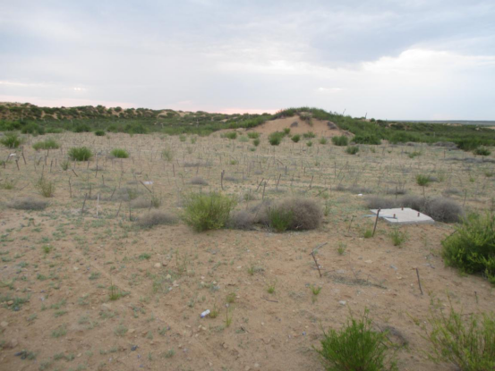 (4)按施工作业带宽度确定植被恢复范围,采用插播沙蒿网格固沙,尺寸为750px×750px,并洒草籽10kg/亩。